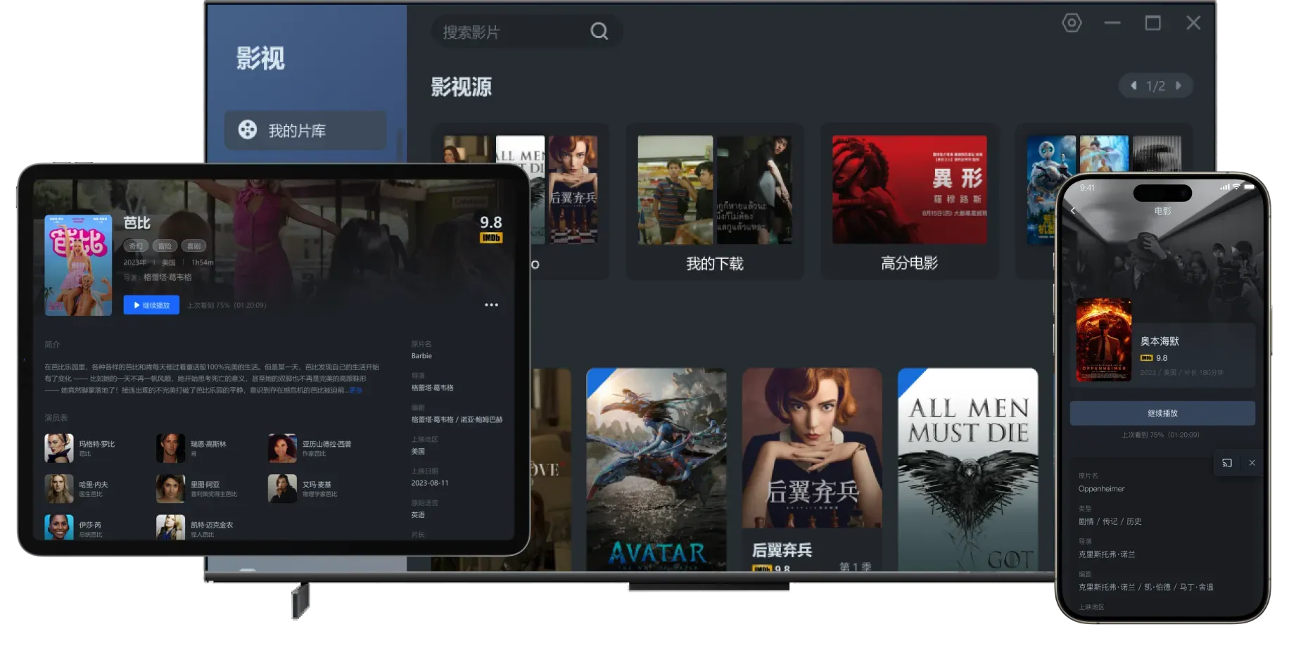 智能匹配精美的海报和影视信息,轻松打造媒体中⼼,⽀持进⾏字幕、⾳轨的输出选择,提供多种画质选项
